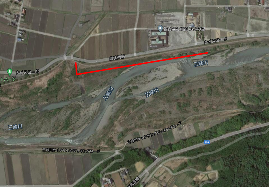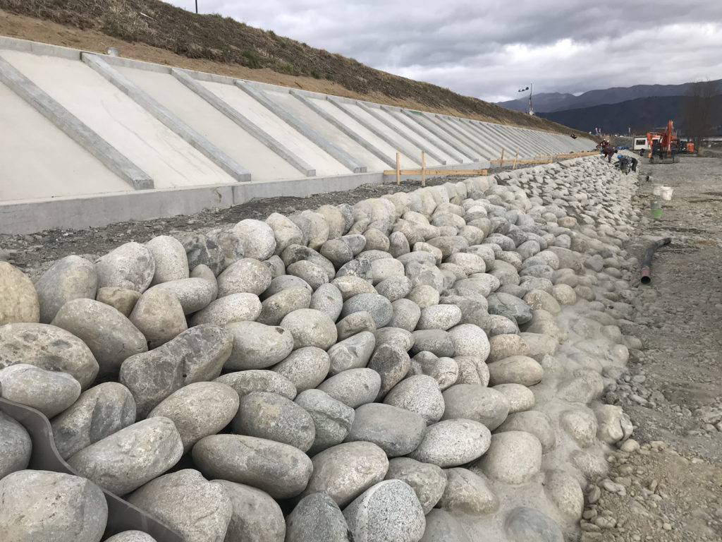 南アルプスから流れ出る三峰川。介護老人保健施設みぶの里前の護岸の災害復旧工事は、着工前にも増水によって再度被災し、工事規模が2倍近くになりました。