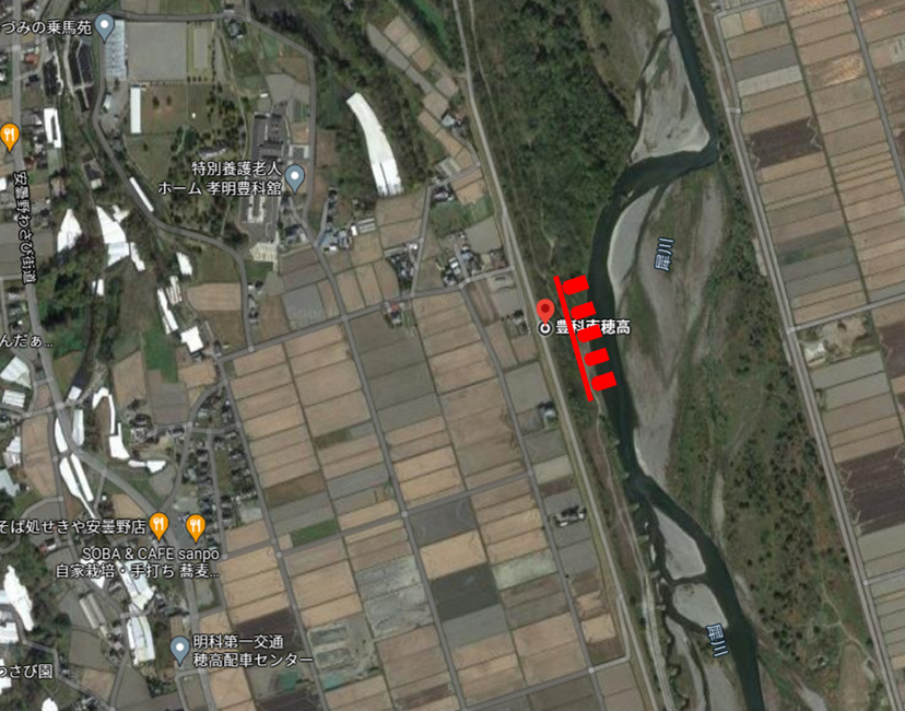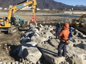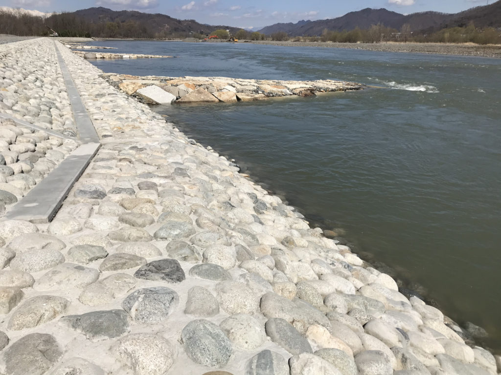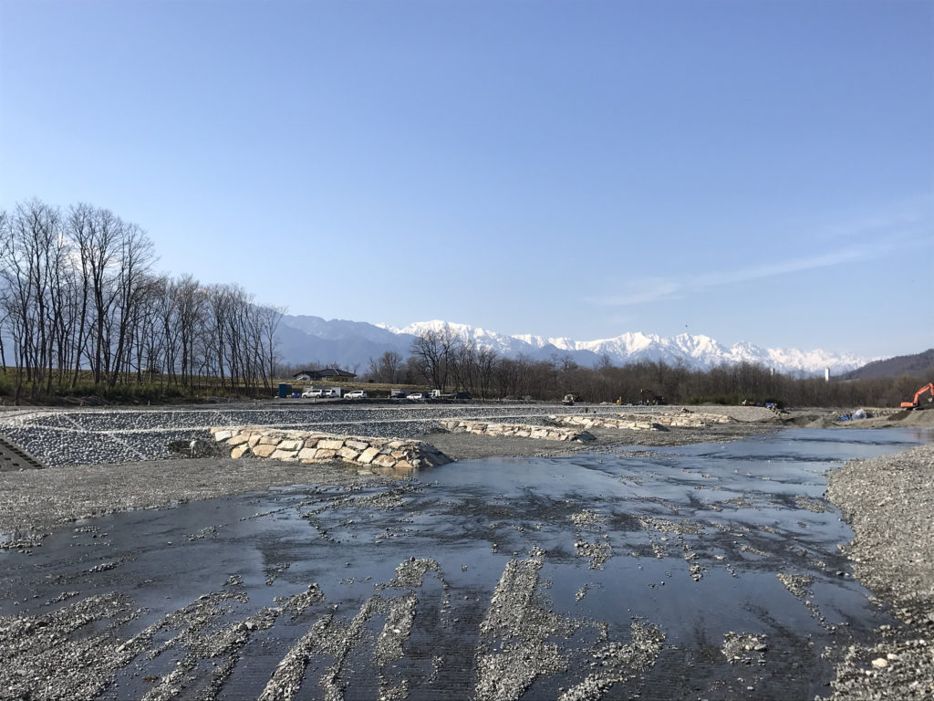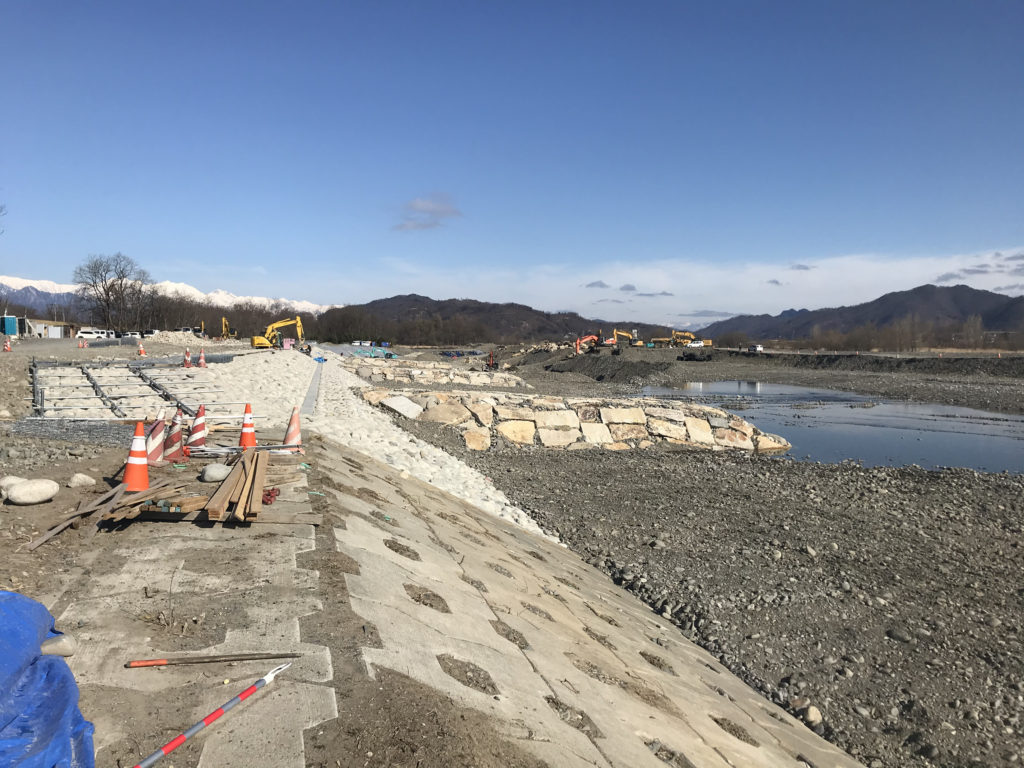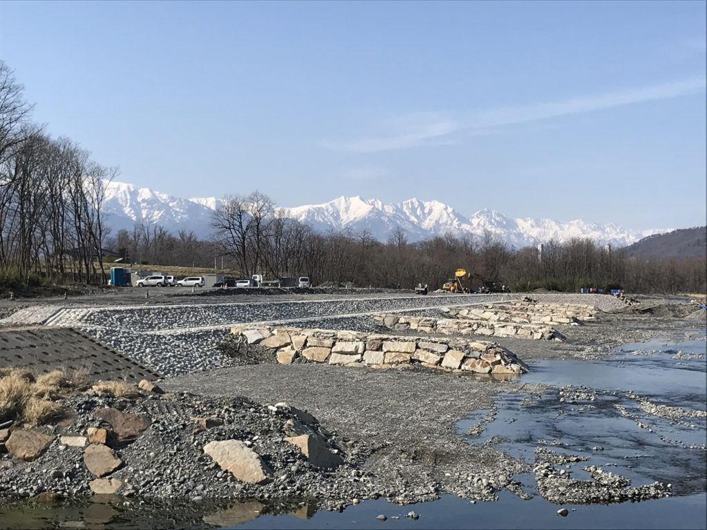 安曇野大王わさび園東に位置する、犀川左岸の南穂高護岸。この辺り一帯は湧水地帯の為、工事中も湧水対策に追われました。
