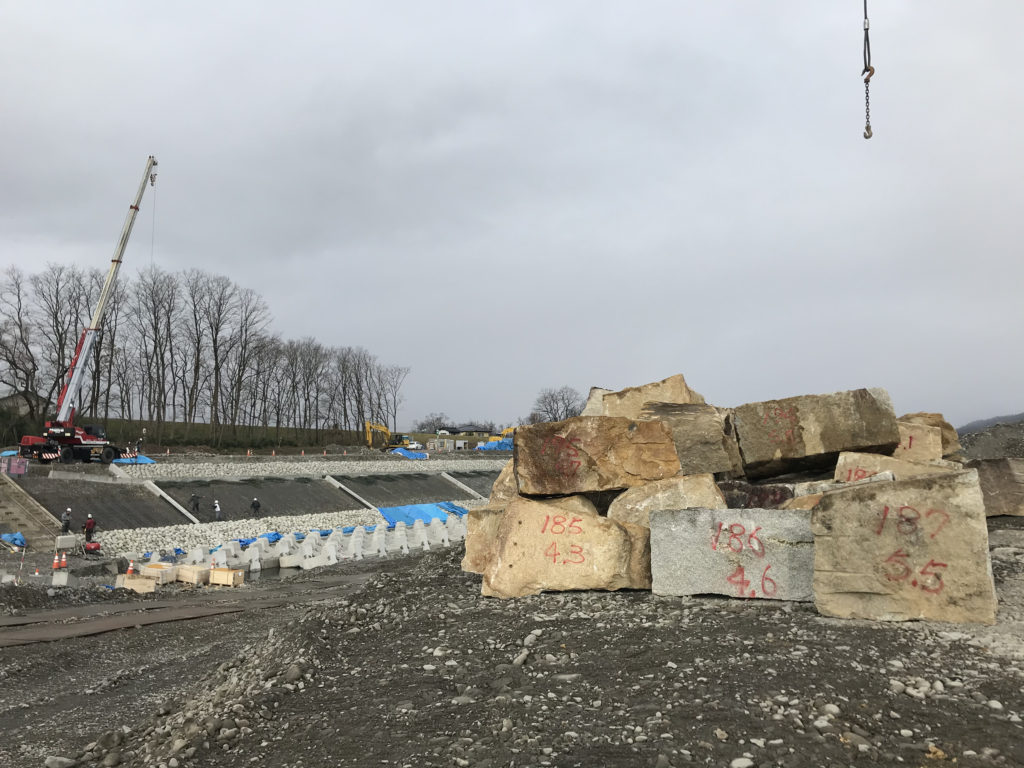 ●工種/規模① 背面アンカー一体型練石張AZOT-STONE工法 3,992m3 巨石水制工5基