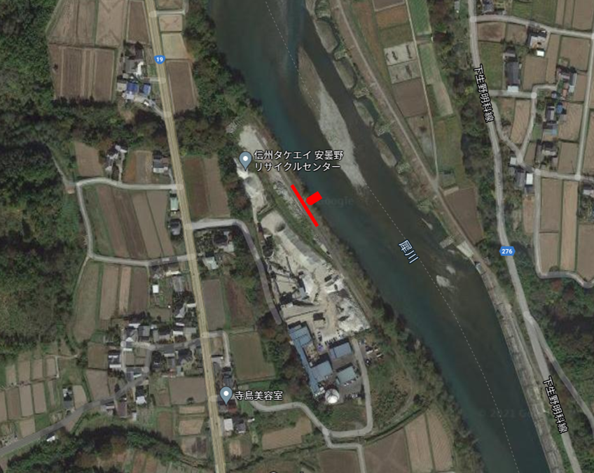 松本平で穂高川、高瀬川と合流した犀川は、生坂村方面へと北上する、左右に山が迫るエリアにある南陸郷護岸。令和元年、台風19号により、被災しました。
