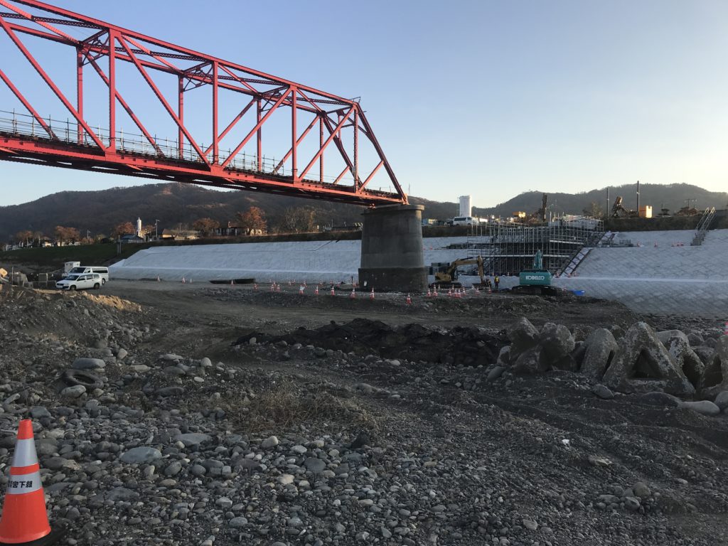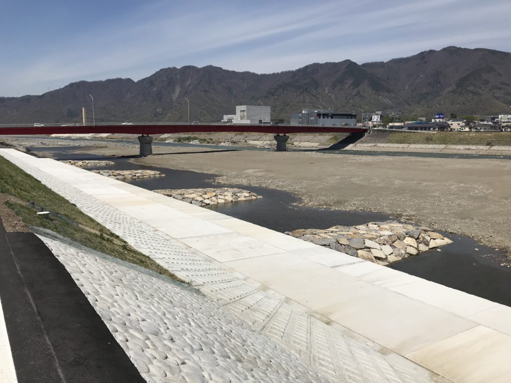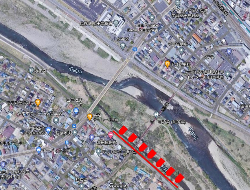 上田警察署対岸にある諏訪形護岸は令和元年台風19号により、上田電鉄別所線の赤い鉄橋が