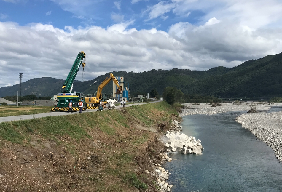 梓川にアルプス大橋下流左岸にある島内護岸は、令和元年台風19号により被災しました。